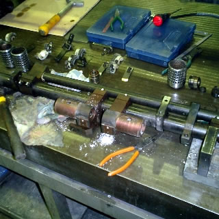 真空車は、掃除(左)をした後、軸、ベアリング等を交換し、組み付けます(右)。