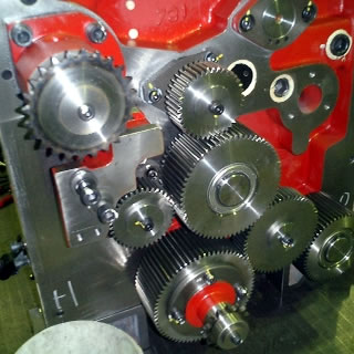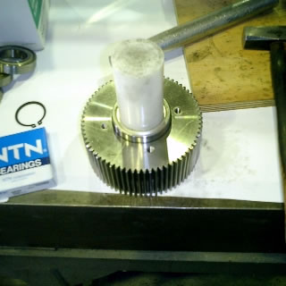 駆動側ギヤーを取り外し、掃除後、ベアリングを交換し(左)、組み付けます(右)。