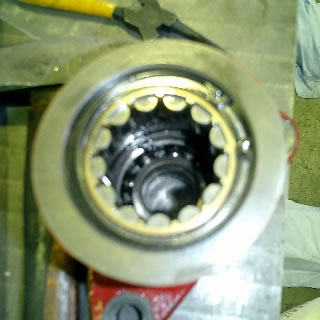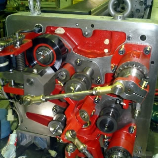 操作側の横振りロッド、ロッド部のベアリングを交換し(左)、組みつけていきます(右)。