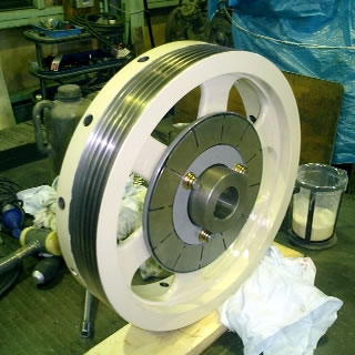 メインモーターの動力を伝えるフライホイールは、掃除後、電磁ブレーキを交換し、塗装します。